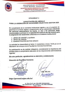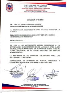 Citación 01/2025 Dirigido a Secretarios, Directores de Departamento, Decanos y UNADEFs de la UAJMS. Capacitación a llevarse a cabo el día miércoles 12 de noviembre de 2025 en el salón Auditorio del edificio administrativo.