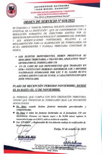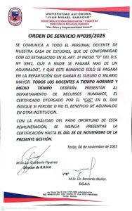 Orden de Servicio N° 039/2025 Hasta el 28 de noviembre de 2025. Se instruye a todos los docentes con dedicación a Tiempo Horario y Medio Tiempo, que deben presentar el Certificado CAS donde se indique la percepción o no del beneficio de aguinaldo en otra institución.