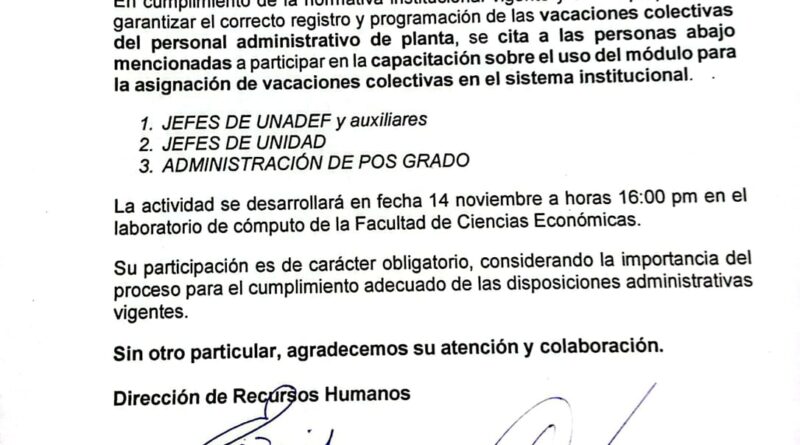 Citación N° 02/2025 . Se cita a la capacitación para el registro de vacaciones colectivas 2025 a los jefes de Unidad, UNADEFs, Adm. de Posgrado.