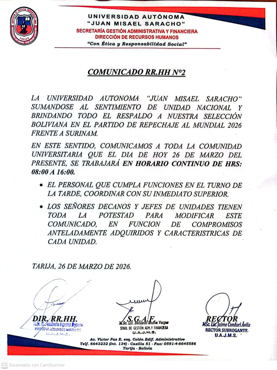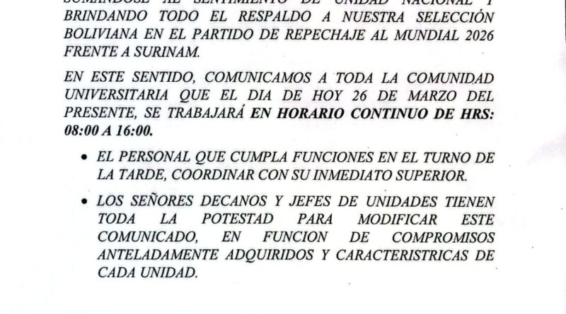 Comunicado 02/2026. Se comunica que hoy 26 de marzo de 2026 se trabajará en horario continuo de Horas 8:00 a 16:00.