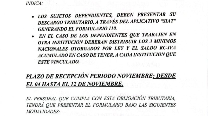 Plazo y condiciones de presentación de Formulario 110 RC-IVA (nov)