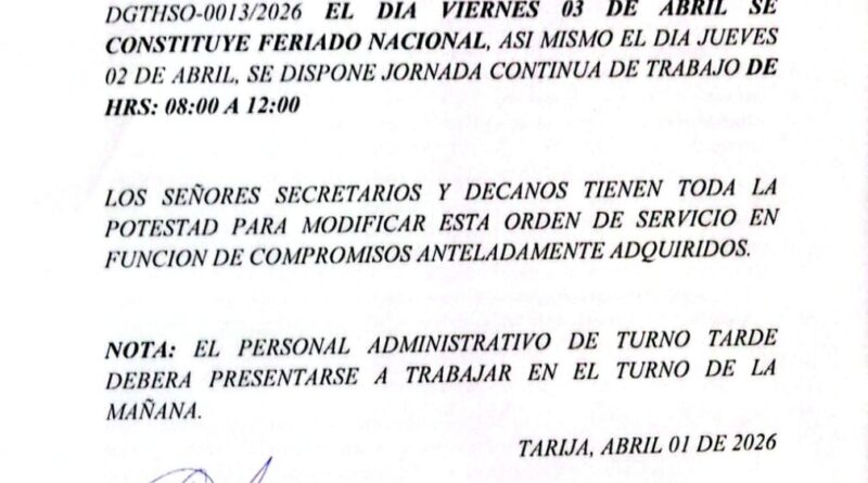 Leer másOrden de Servicio N° 008/2026 Se dispone asueto de media jornada laboral a partir de las 12:00 el día jueves